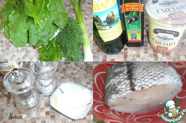 Зелень лучше брать самую свежую, прямо с грядки, как у меня. Вот сегодня Бог послал нам то, что вы видите на фотографии. Всю зелень нужно хорошенько помыть (можно шпинат или щавель), лук-порей, петрушку и укроп. Масло оливковое, сливочное, сметану (или сливки для тех, у кого повышенная кислотность), сухое вино (для детей не обязательно), специи и саму рыбу (можно из семейства тресковых или другую белую рыбку. На праздник можно и сёмгу сделать под таким соусом)