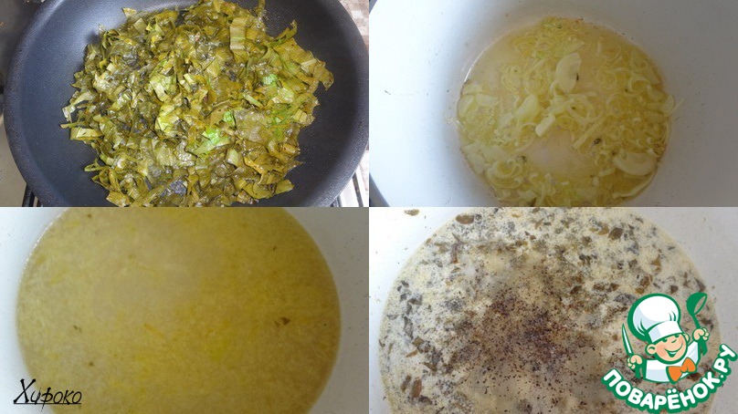Разогреть на сковороде сливочное масло и поджарить на нём мелко нарезанный щавель, потушить минут пять. В сотейнике разогреть оливковое масло, немного припустить в нём порезанный лук-порей (или шалот). Влить бульон и сухое вино. Готовьте на маленьком огне пока жидкость не уварится до половины. Снимите с огня. Положите в бульон щавель (или шпинат), сметану (или сливки), добавьте по вкусу специи, какие вы любите и какие вам можно по здоровью. Я положила немного сахару, чтобы смягчить кислый вкус))). Немного можно пробить ручным блендером, чтобы оставались видимые кусочки зелени.