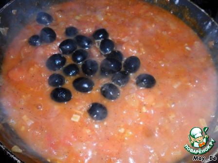 Когда помидоры начнут давать сок, добавить маслины, потушить 2 мин.