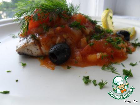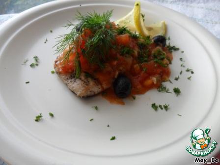 На тарелку выложить кусочек тунца, сверху выложить томатный гарнир, посыпать укропом. Украсить долькой лимона.