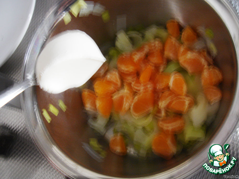 Когда порей станет мягким, добавьте мандарины, слейте воду и положите столовую ложку сметаны.