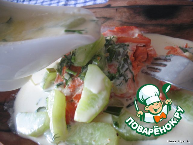 | Мне показался очень интересным этот рецепт тем, что делается быстро, из подручных продуктов, и хозяйка уверяла, что огурцы в таком соусе не чувствуются как тушеные или вареные. Все правда - как ни странно, вкус и запах у огурцов совершенно свежие. |