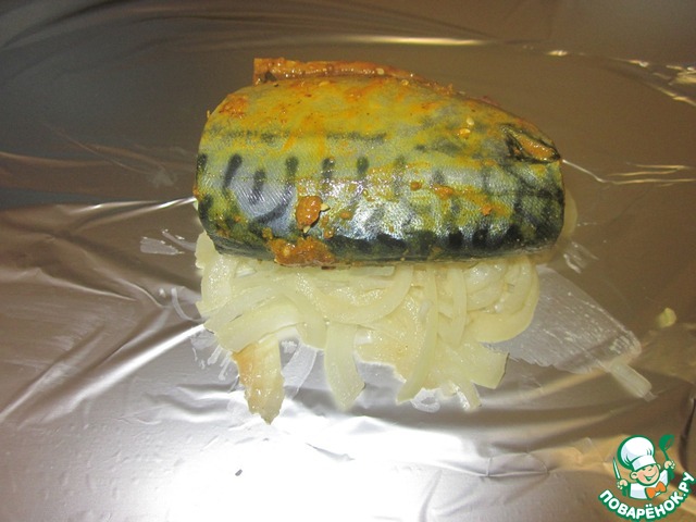 На фольгу (размер фольги такой, чтобы можно было сделать мешок с воздушной прослойкой) выкладываю лук. На подушку из лука укладываю скумбрию.