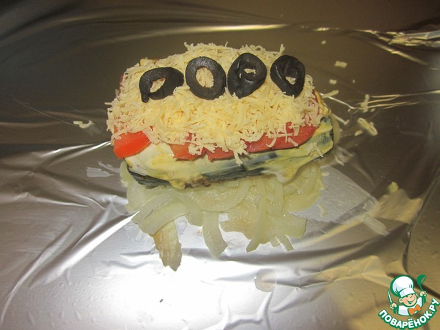 Сверху чуть обмазываю тушку майонезом, выкладываю помидоры полукольцами, сыр, потертый на мелкую терку, оливки кружочками.