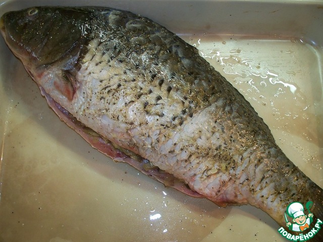 Карпа натираем солью и перцем внутри и снаружи, поливаем внутри лимонным соком, фаршируем. Выкладываем на противень, смазываем растопленным сливочным маслом и ставим в духовку на 45 минут (температура 180 градусов). Маслом необходимо смазать еще раза 3-4 в процессе приготовления. Именно от сливочного масла рыбка будет выглядеть золотой.