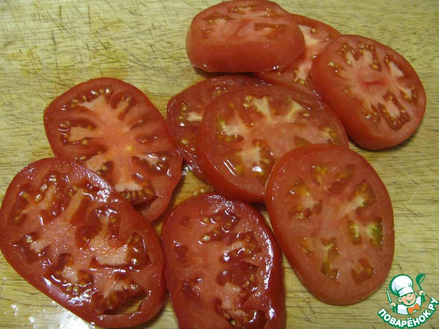 1.Помидоры очистить от кожицы и нарезать кружочками.