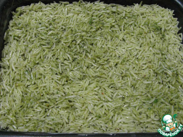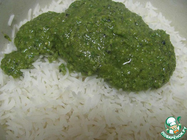 3.Рис отварить в подсоленной воде 15 минут до полуготовности, затем откинуть на дуршлаг, чтобы стекла вода, а затем смешать с песто. Можно купить песто в магазине, у меня он домашнего изготовления по рецепту поваренка "апайя", за что ей огромное спасибо. Вот ссылка http://www.povarenok.ru/recipes/show/42042/. Только вместо обычного базилика я использовала лимонный базилик, он к рыбе подходит идеально.