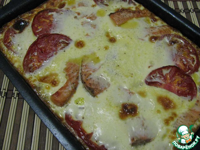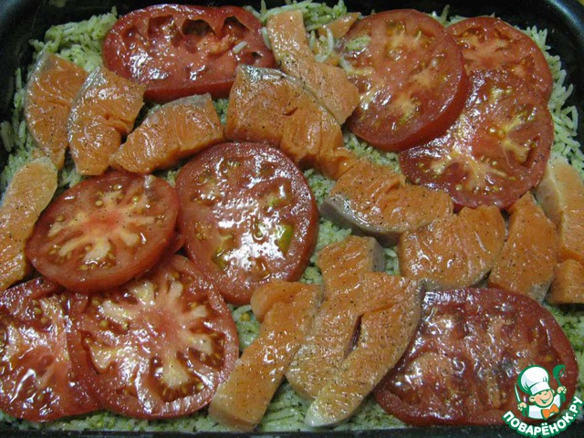 5.Сверху раскладываем помидоры и рыбу (произвольно). Посолить и поперчить.