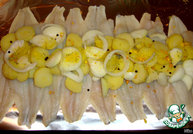 На фольгу разложить филе рыбы хвостиками наружу. Картофель положить вдоль всей длины филе. На картофель лук. Верх посыпать солёной смесью (у меня домашняя - сухие корни, зелень, соль), чёрным перцем, можно положить пару лавровых листочков