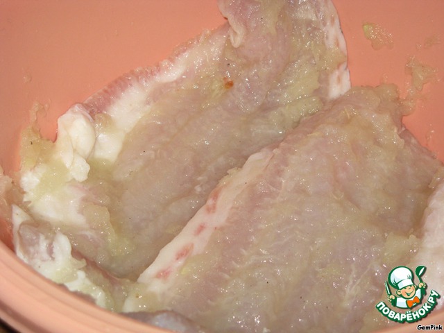 Для этого большую луковицу измельчим в кашицу (можно на терке, можно в процессоре).. Вытирая горькие слезы (в том случае, если вы терли на терке), обмазываем хорошенько этой кашицей филе нашей рыбки