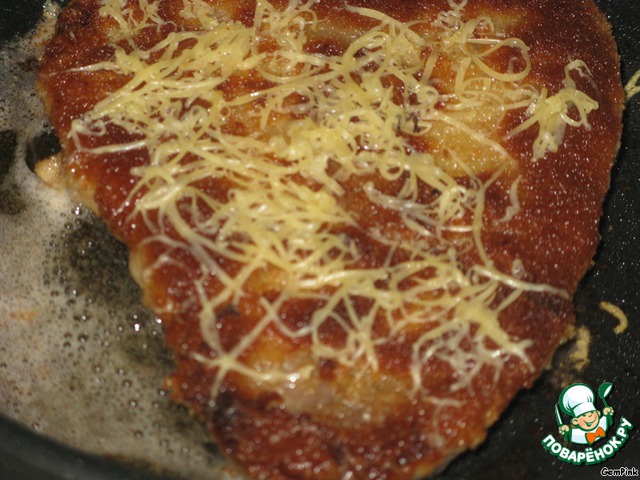 когда одна сторона поджарится, переворачиваем и притрушиваем тертым сыром..