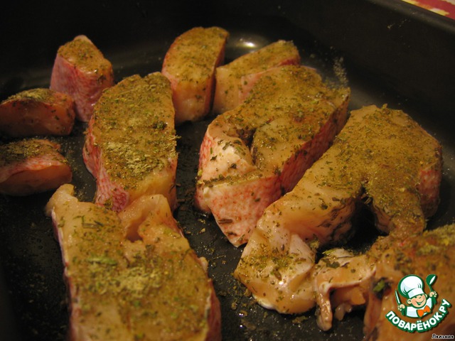 Рыбу размораживаем, моем, нарезаем порционными кусками, слегка обваливаем в приправе (можно и без нее, она почти ничего не меняет),и укладываем в форму для запекания.