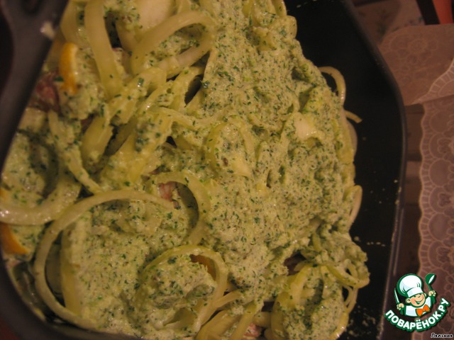 Этим соусом заливаем рыбу, кладем туда 2 лавровых листика и отправляем рыбу в духовку примерно на 30 минут.