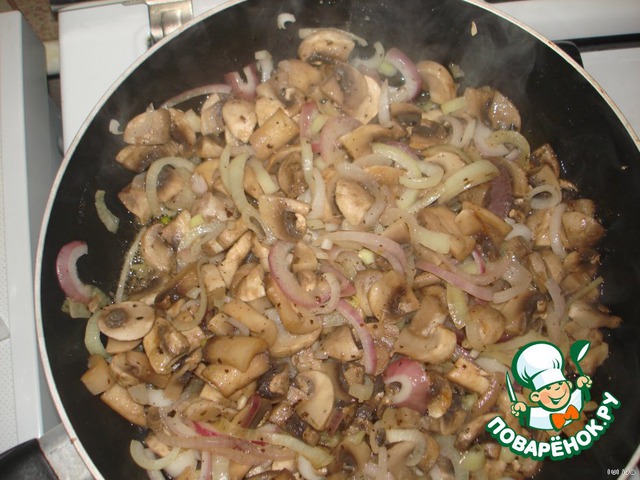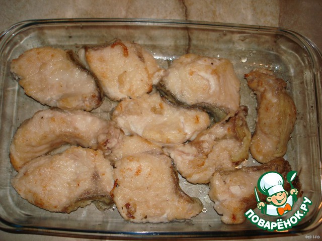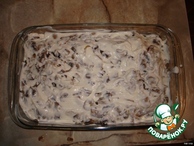 3. Выложить в огнеупорную форму обжаренные стейки сома, сверху – обжаренные с луком шампиньоны,