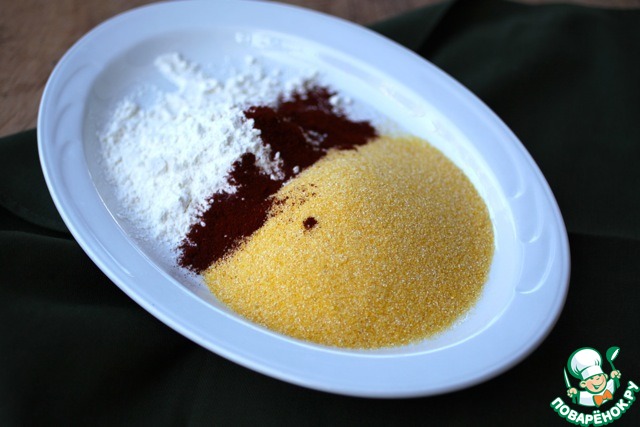 Смешать сладкую паприку, пшеничную муку и кукурузную.