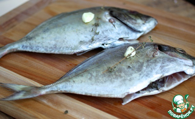 Рыбу промыть, выпотрошить, посолить. В брюшко рыбы вставить веточку розмарина и зубец чеснока. Рыбу обвалять в смеси муки и паприки и обжарить на разогретой сковороде 5-6 минут с каждой стороны. Далее положить на салфетку, чтоб убрать излишки масла!