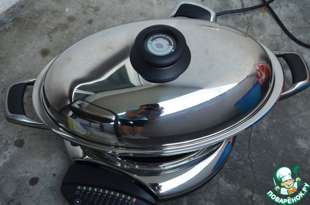 Я копчу на балконе, у меня есть переносная плита, которая сохраняет долго тепло. Ставлю на неё гусятницу или сковороду. Включаю розетку и выбираю самую большую мощность на 9 (если у вас 6, то ставьте на 6).