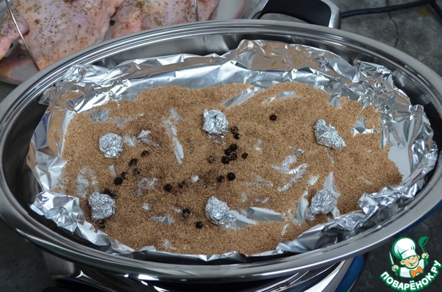 Потом снять крышку, выложить дно фольгой, насыпать 2-3 столовые ложки опилок для копчения. Опилки продаются специально для рыбы и для мяса. Кинуть парочку горошков чёрного перца и сушёных ягод можжевельника для аромата.