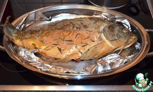 В брюшко карпа положить мытую зелень. Я брала две веточки розмарина и маленький пучок петрушки.