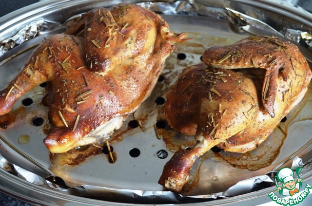 Хорошо посолить, поперчить с обеих сторон и внутри. Сверху на кожу выложить иголочки от розмарина.