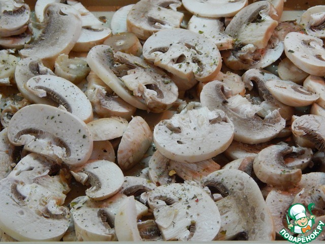 На смазанный маслом большой противень выкладываем порезанные пластинами грибы. Немного солим по вкусу.