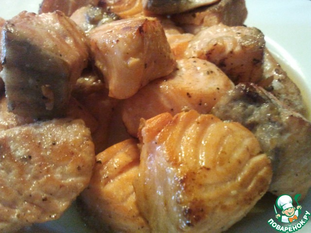Рыбу режем кубиками примерно по 3 см. Солим, перчим, поливаем лимонным соком и даем помариноваться минут 10.