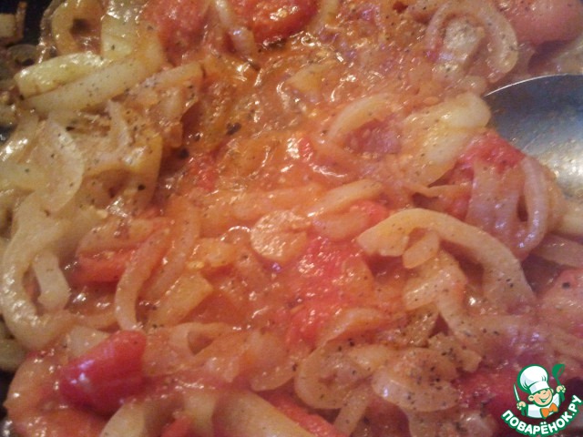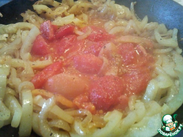 На сковороду с рыбьим жиром выкладываем сначала лук, потом перец. Когда они поджарятся, отгребаем их на края сковороды, а в середину выкладываем помидоры.