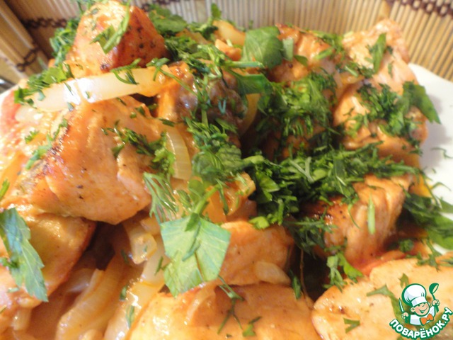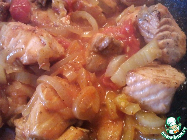ПыСы. Обычно я в подобных блюдах сначала обжариваю овощи, затем на этом же масле - рыбу, а потом добавляю овощи к рыбе и обжариваю вместе. Но форель - рыба жирная и если бы я поступила так, то готовое блюдо вышло бы черезчур жирным. Учтите этот момент, он может пригодится многим при жарке рыбы жирных сортов