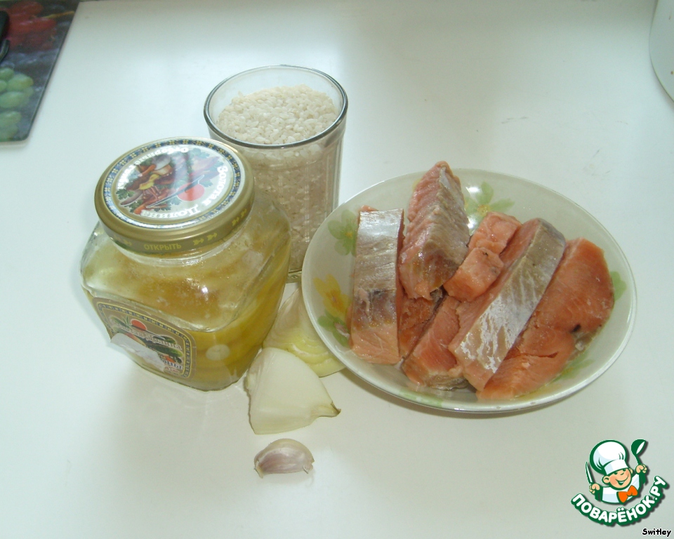 Любым удобным для вас способом нарезаем рыбку, лук, чеснок и лимончики. Рис тщательно промываем.