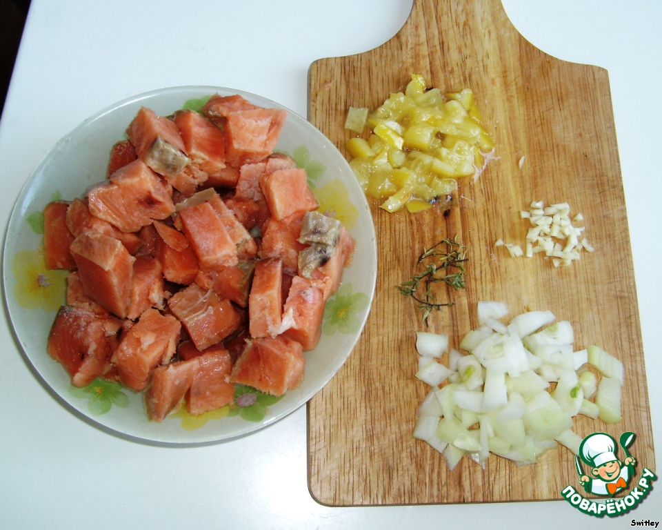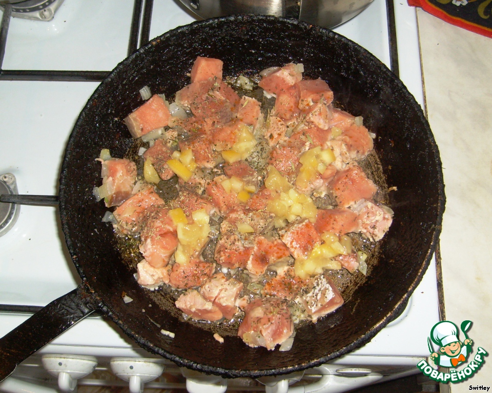 Лук с чесноком слегка обжарить, добавить рыбку, прогреть несколько минут. Когда рыбка "схватится", добавляем лимоны и специи.