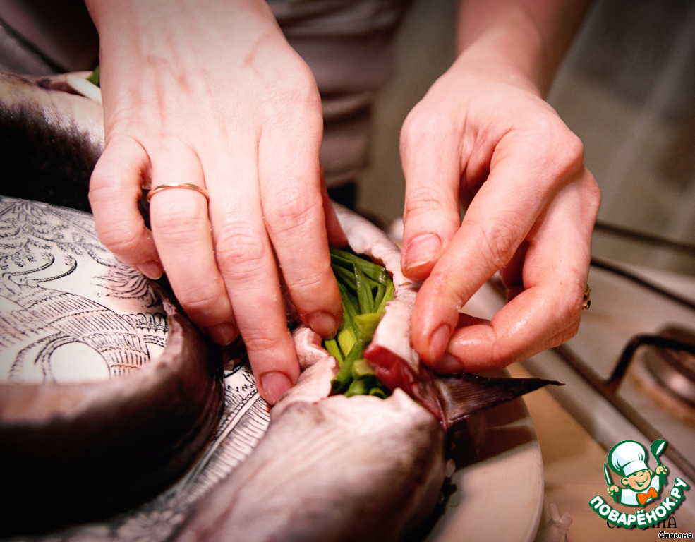 Рыбку разморозить в холодной водичке, но не до конца, чтобы она осталась твердоватой. Последних 15 минут вымочить её в подсоленной воде - это уберёт речной запах. Почистить от потрохов, вымыть, просушить. Натереть угря крупной морской солью, внутрь положить пучок свежего лука, укропа, лавровый лист, перец горошком. Завернуть рыбку в 2 слоя фольги, чтобы было герметично, но просторно, края фольги загнуть. Запекать в духовке при 160-170 град. в течение 40 минут.