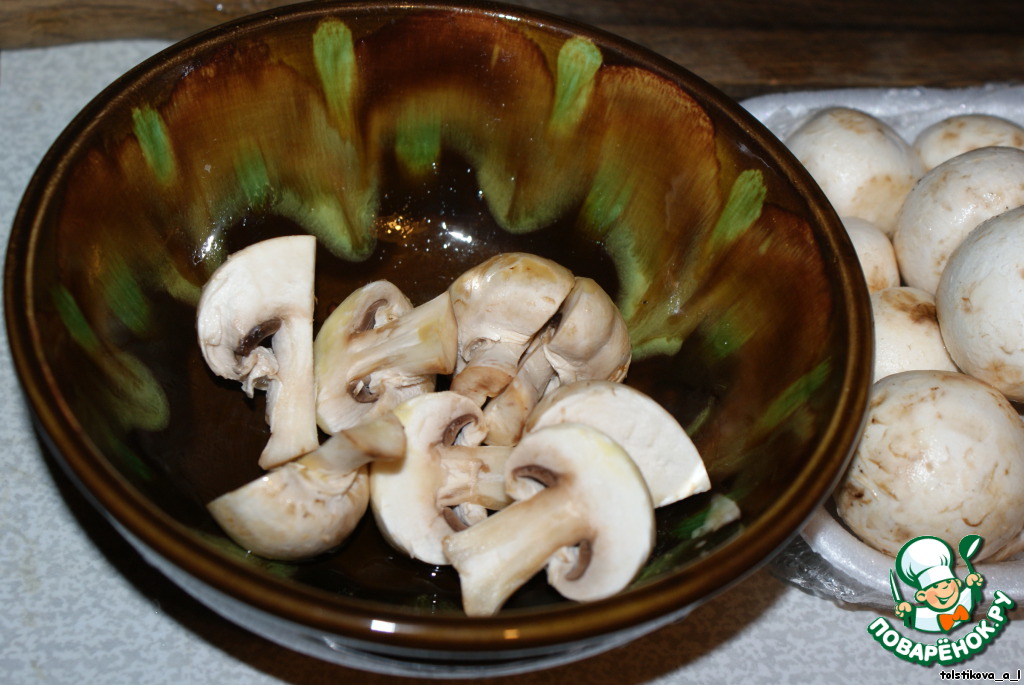 Пока семга маринуется, займемся грибной подушкой. Для этого помоем и порежем грибы и лук.