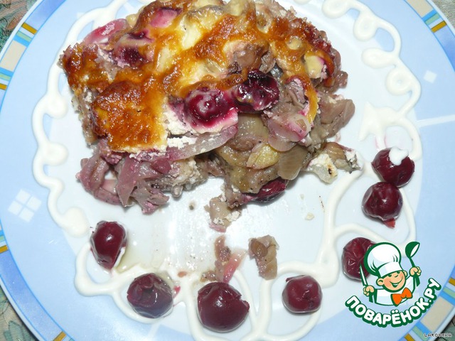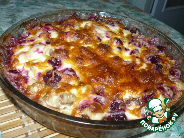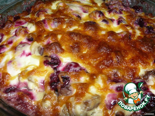 Рыбу посолить, поперчить, и засыпать специями. Грибы потушить Всe сложить слоями. 1 -рыба+лук(полукольцами), 2 -грибы, 3 - вишня , все залить сметаной и сверху засыпать сыром!