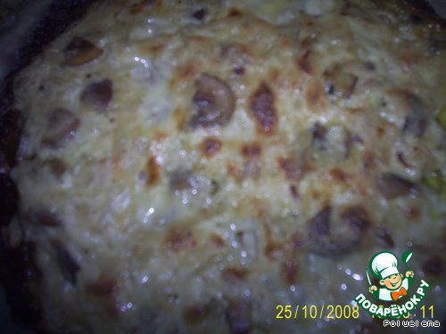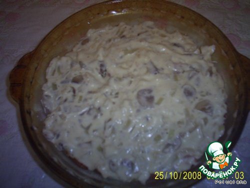 Залить приготовленным луково-грибным соусом и поставить в духовку где-то минут на 45-50 при температуре 160-180 градусов.