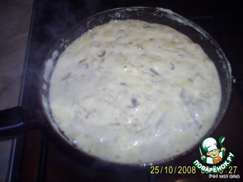 В лук добавить сметану с майонезом 50/50. У меня ушло всего около 250 г. Посолить, поперчить и прогреть еще минут 5.