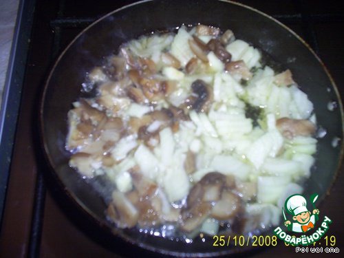 Лук порезать полукольцами и обжарить на сливочном масле вместе с шампиньонами минут 10.