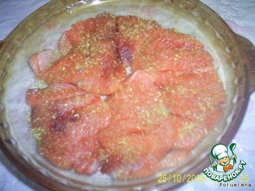 Филе горбуши нарезать порционно. Добавить специи по вкусу. Я добавила приправу для рыбных блюд (с лимонным перчиком).