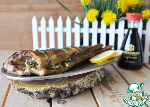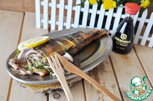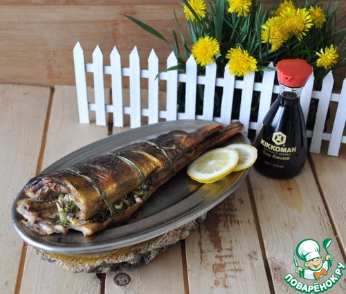 Разрезаем тушку рыбы вдоль хребта, поливаем соком лимона и соевым соусом ТМ Kikkoman. Отставляем мариноваться.