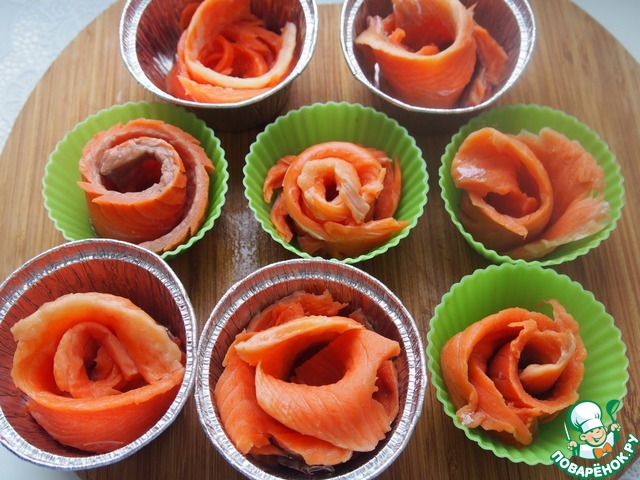 Свернуть полоски рулетиками и поместить их в силиконовые формочки, смазанные оливковым маслом.