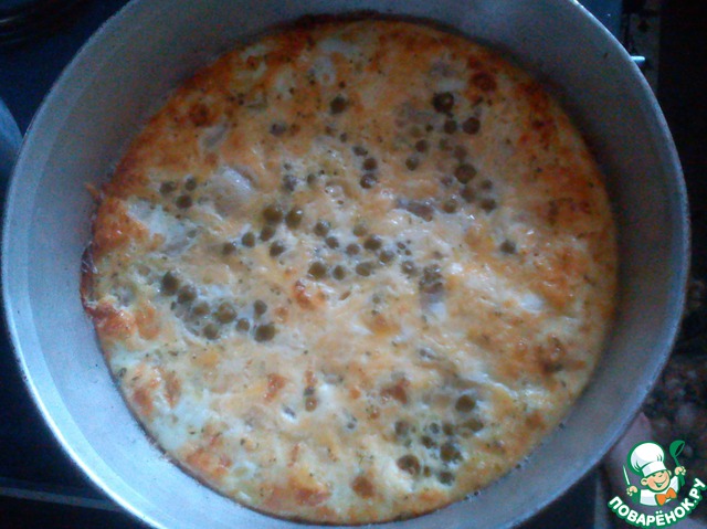 В форму выложить на дно обжаренный лук, затем рыбку и сверху зеленый горошек