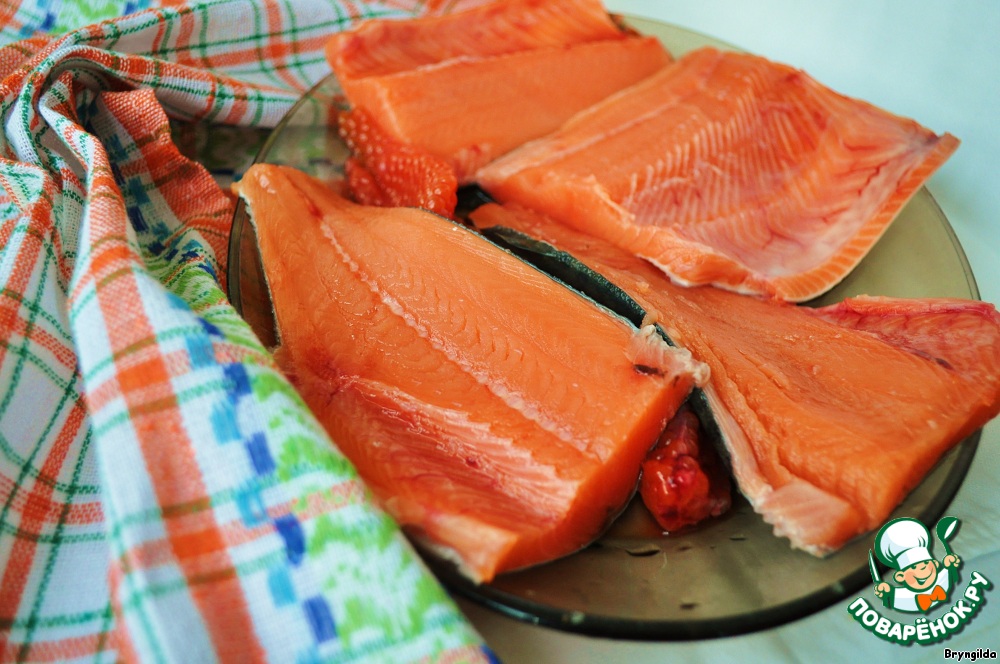 | Друзья подвезли свежайший лосось с Камчатки. Замечателен он тем, что вырос в морских водах и был очень свежий, поэтому ни в каких сложных маринадах не нуждается. Любителям тривиальных блюд посвящается. |