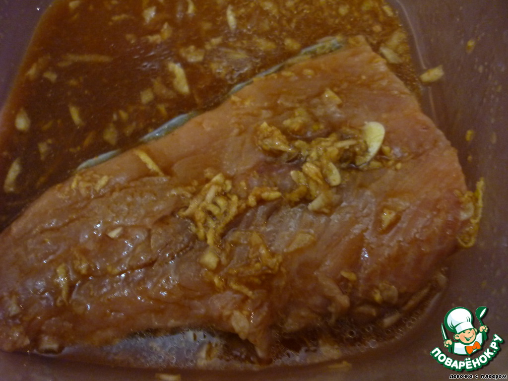 Лосось нарезать порционными кусками. Замариновать рыбу в маринаде на час, время от времени переворачивать кусочки, чтобы она вся пропиталась маринадом.