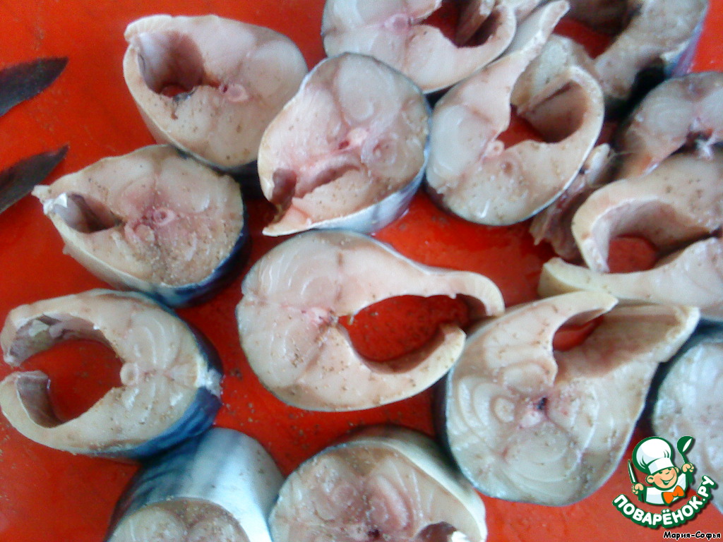 Подготовленную рыбу нарезать на порционные куски, посолить и поперчить