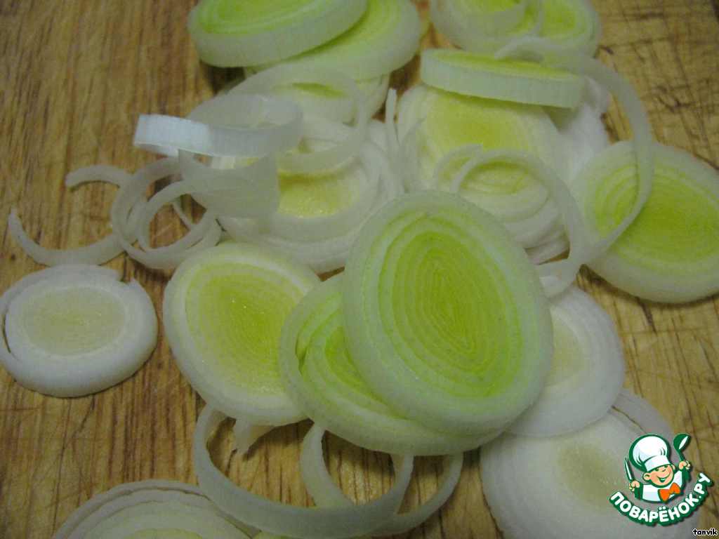 Овощи вымыть, почистить и обсушить. Белую часть лука-порея нарезать кольцами.