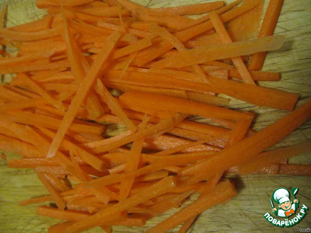 Морковь - соломкой. Обжарить овощи с 2 ст.л растительного масла 3 минуты. Слегка посолить.
