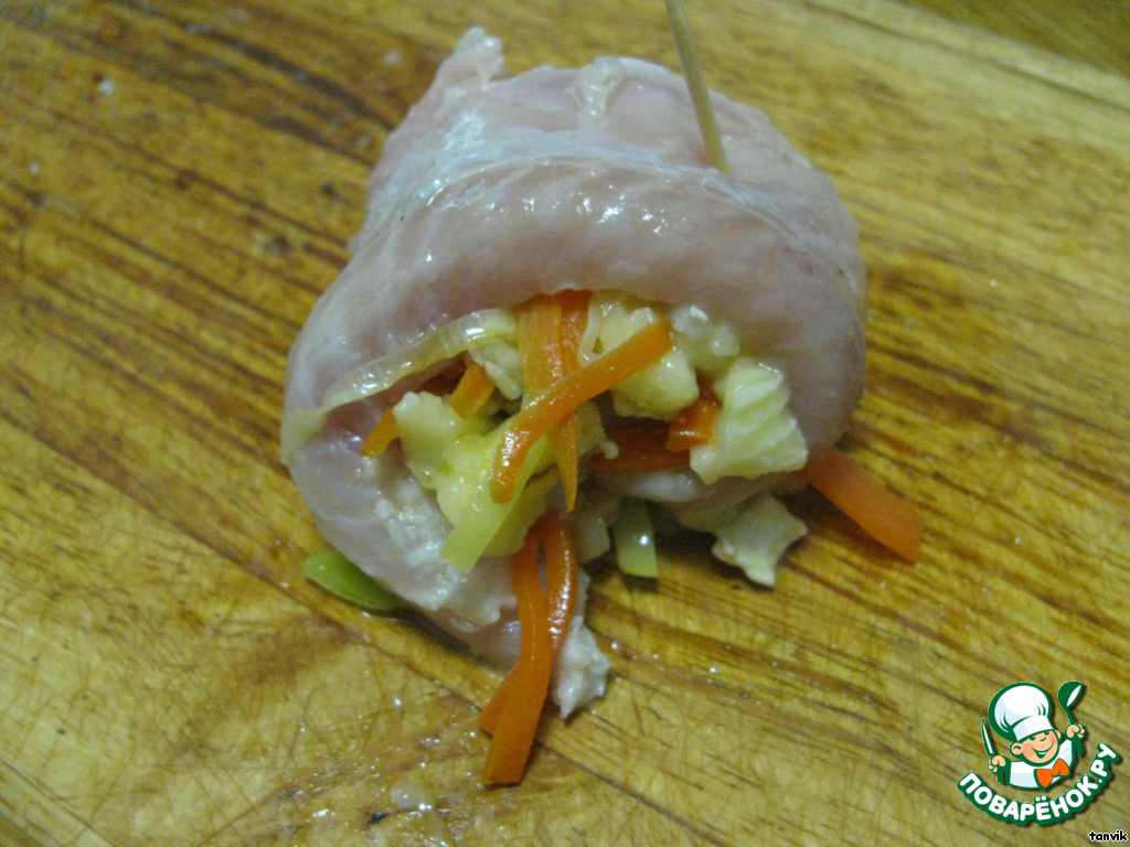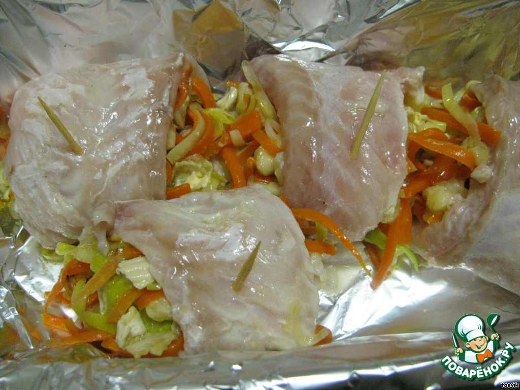 Рыбу вымыть, обсушить и сбрызнуть лимонным соком. Положить на каждое филе овощную начинку, свернуть рулетиком и закрепить шпажкой (зубочисткой).