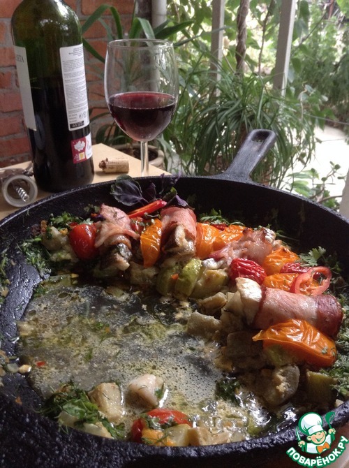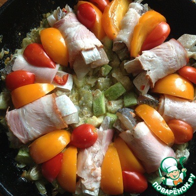 Помидоры дадут сок, бекон пропитает овощи ароматом костра, а рыбка будет с привкусом копчености.
