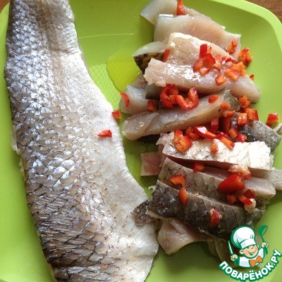 Берем филе рыбы и нарезаем на тонкие ломтики, солим, перчим, посыпаем перцем чили, сбрызгиваем оливковым (растительным) маслом.