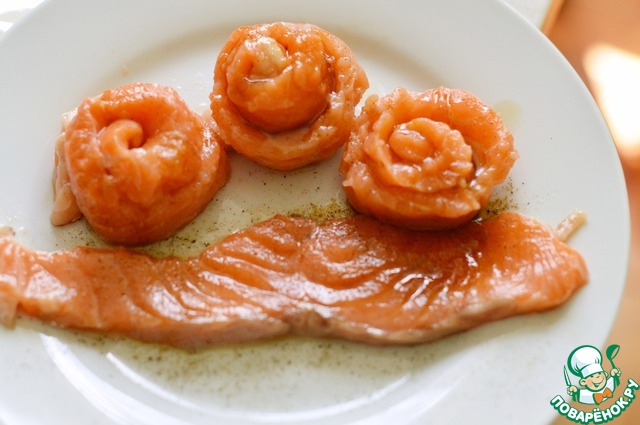 1. Семгу нарезать полосками, толщиной примерно 0.5 см. Можно просто взять стейки или кусочки филе.