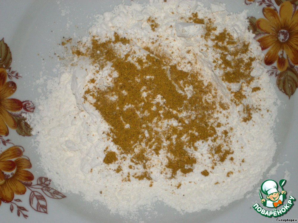 Готовим панировку: к муке добавляем карри и перемешиваем.